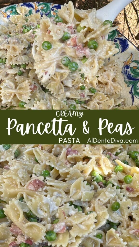 Creamy pancetta and peas pasta is the ultimate comfort food made with crispy pancetta and peas in a creamy cheese sauce served over pasta.