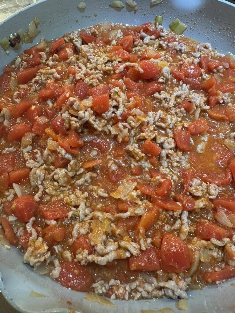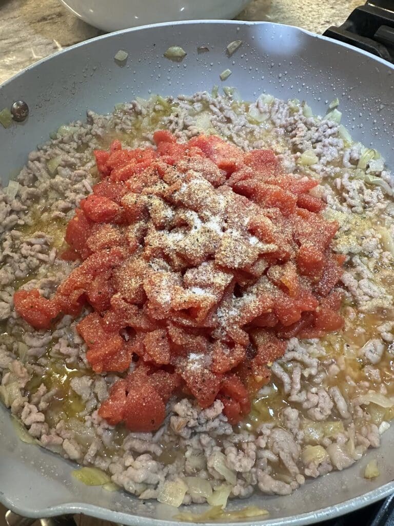 - Once the sausage is browned, add the diced tomatoes and tomato sauce.