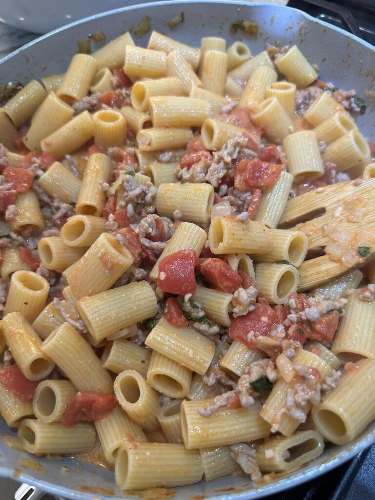 - Add the pasta water and rigatoni to the sauce and stir everything together until the pasta is coated in the sauce.