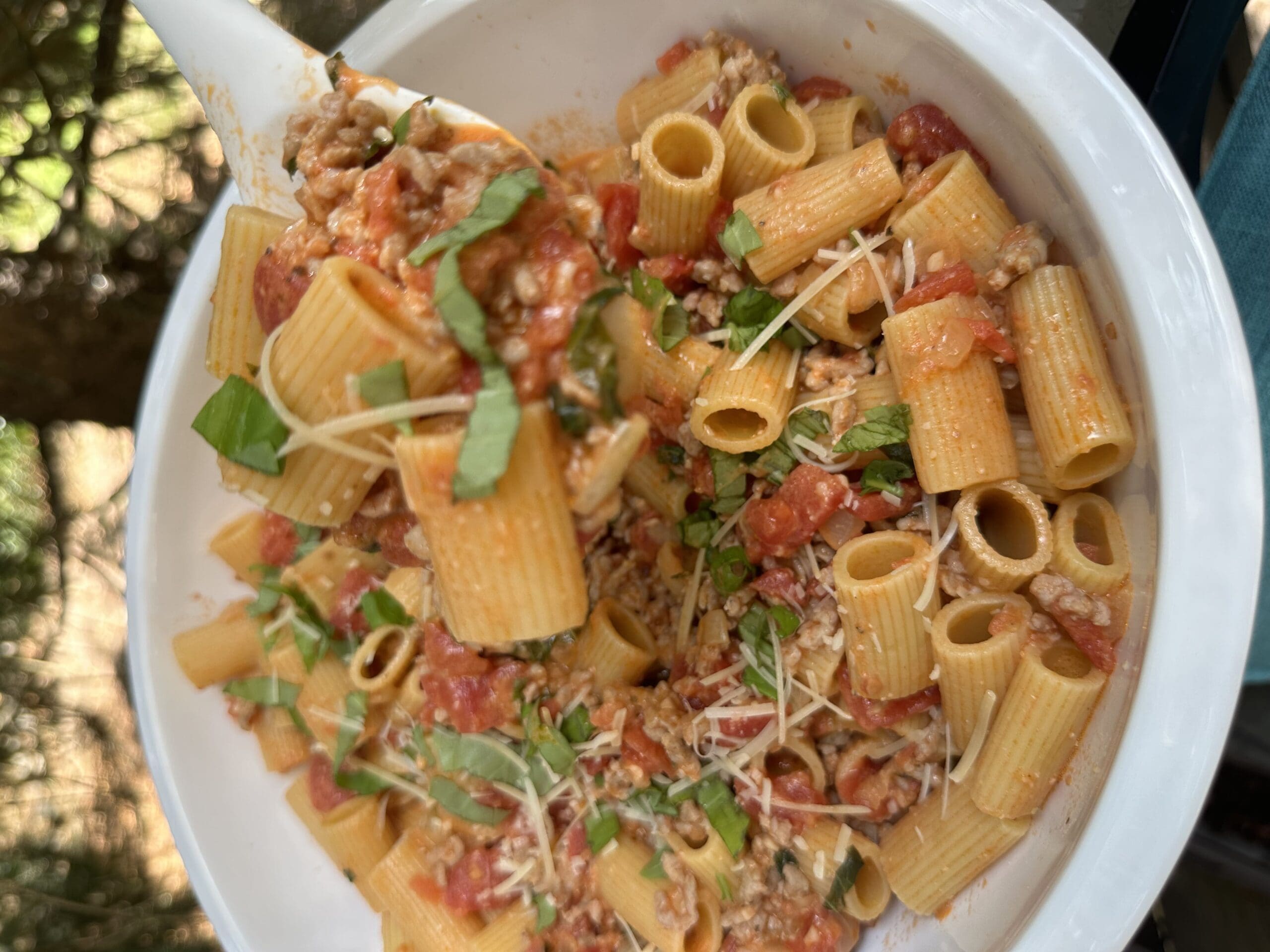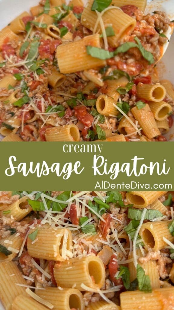 This creamy sausage rigatoni is made with crumbled Italian sausage simmered in creamy tomato sauce and served ovrer pasta for the ultimate comfort food.