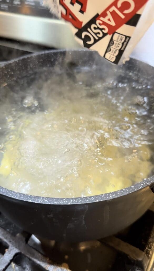 First, start boiling the water for the gnocchi and cook it according to the directions on the package.