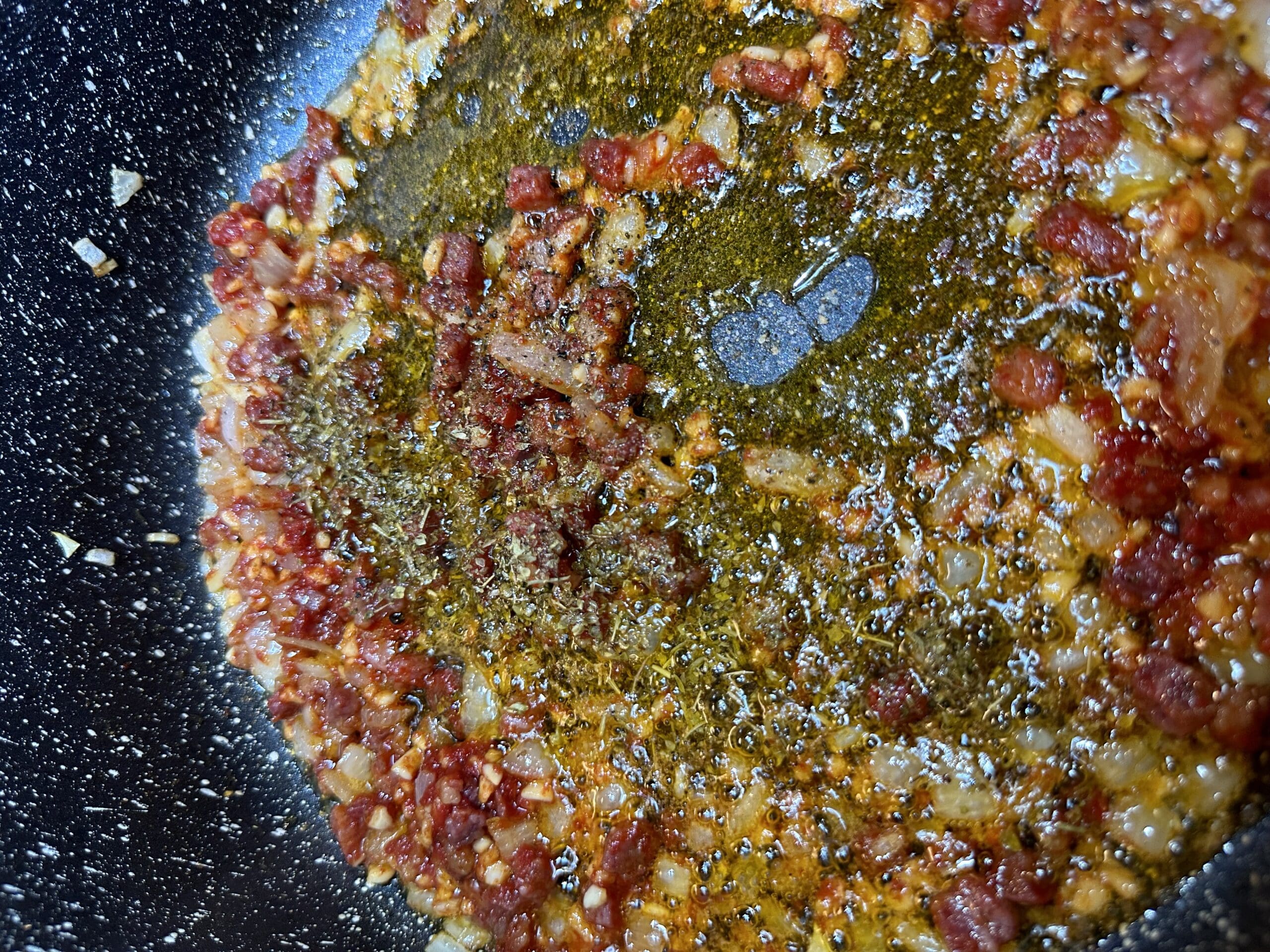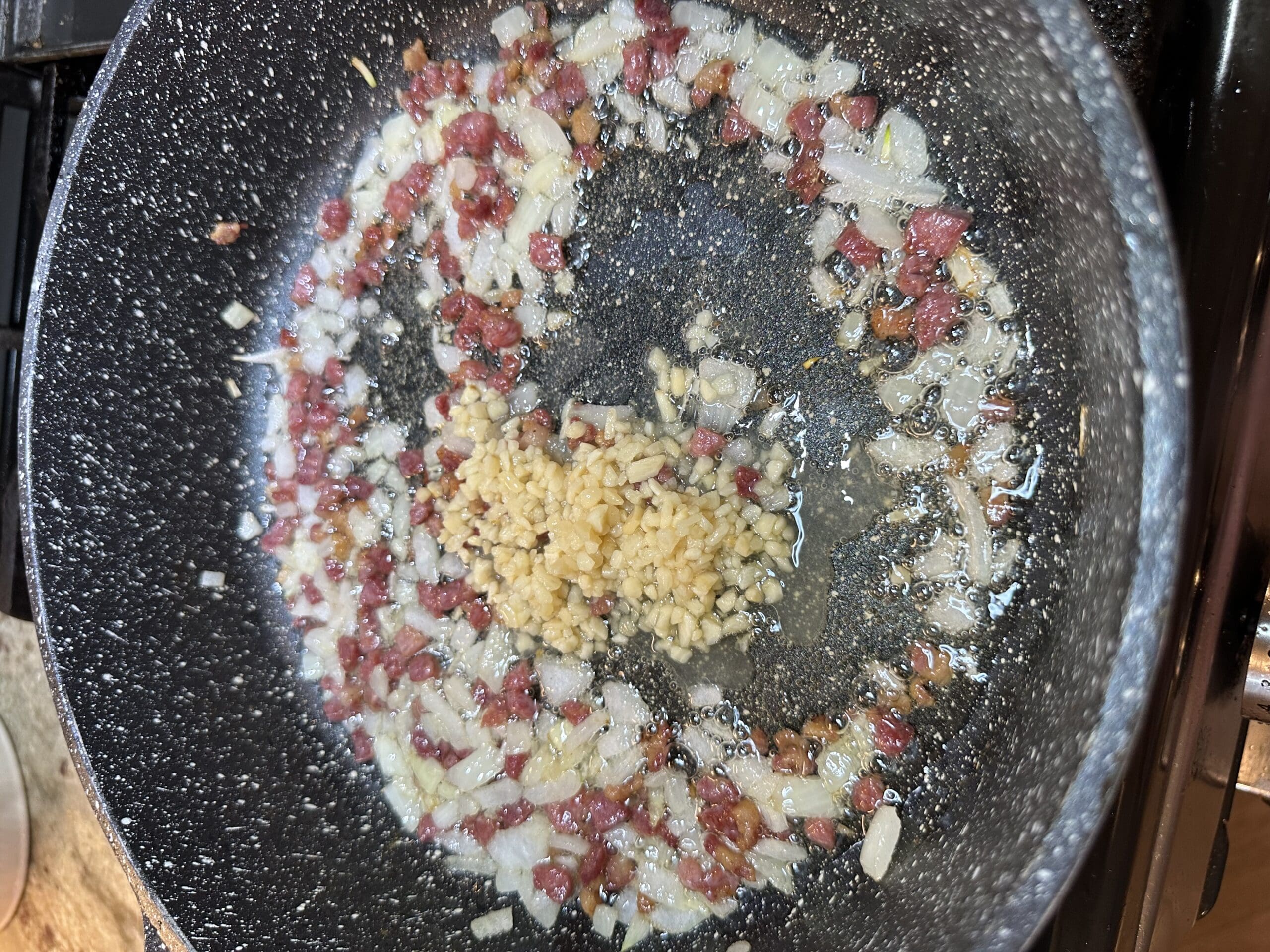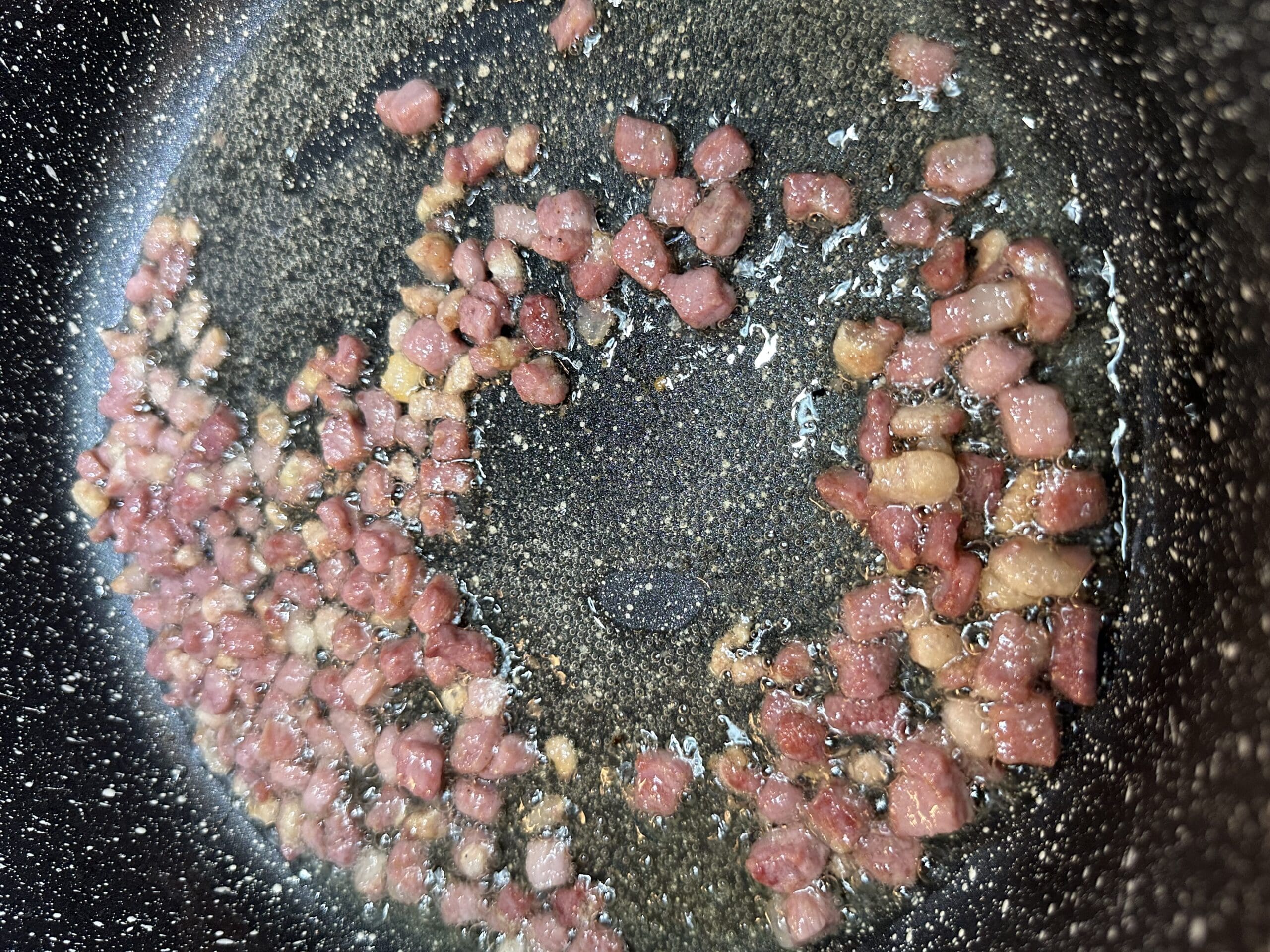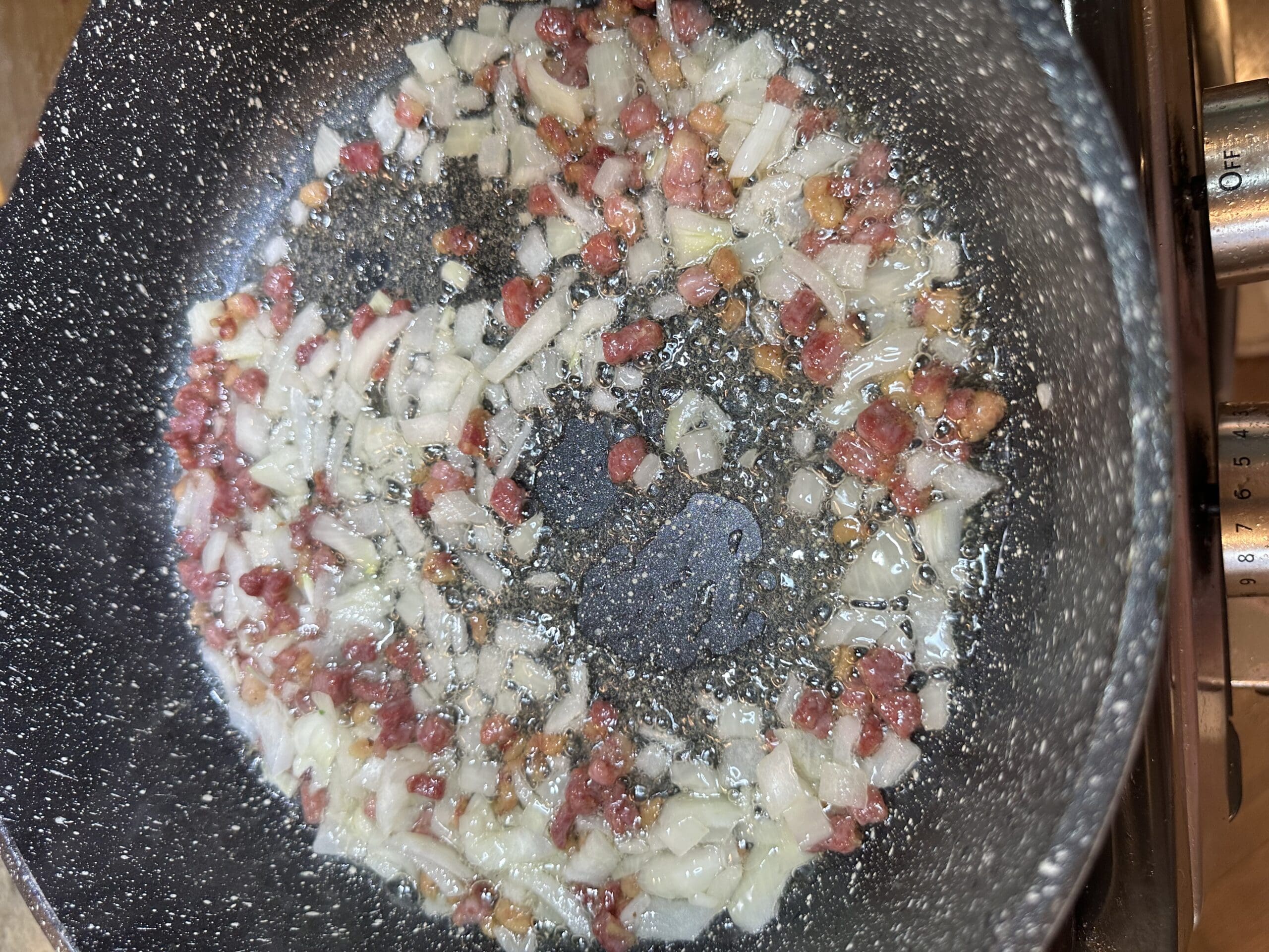 Now add the onions and sauté them along with the pancetta until the onions turn translucent and the pancetta is nice and crispy.