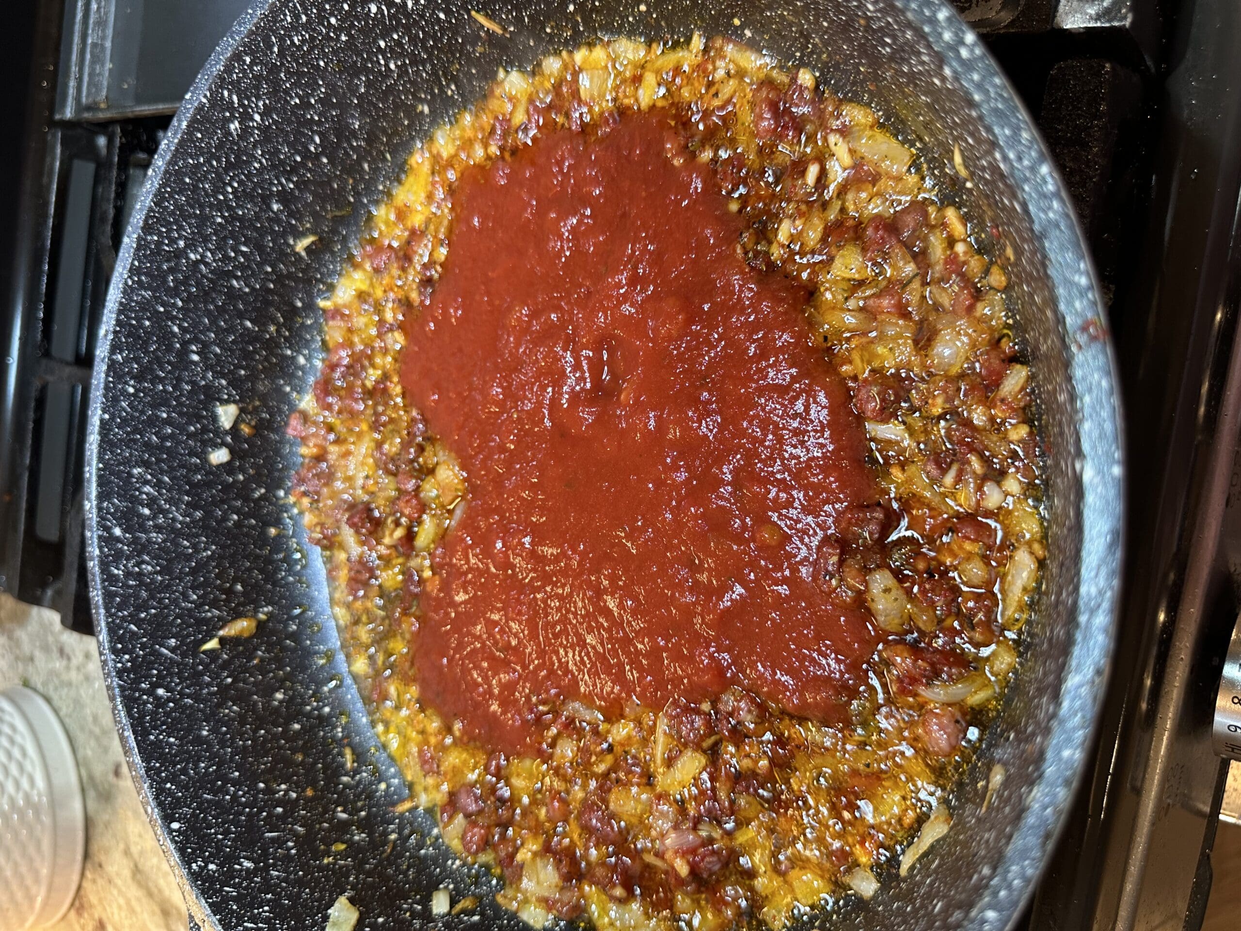 Now stir in the crushed tomatoes, cream and Parmesan cheese.
