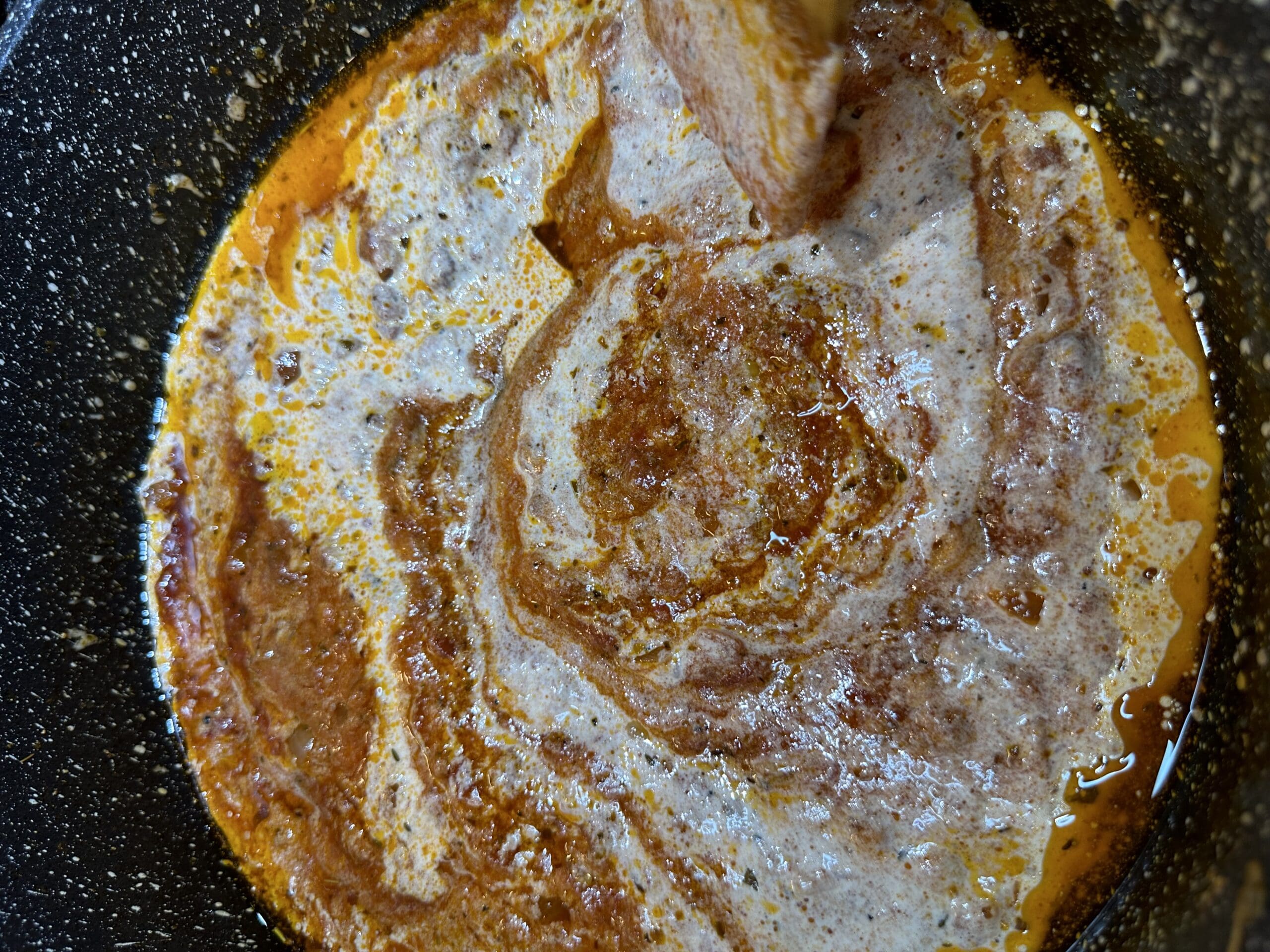 Then turn the heat down to medium low and reseason the sauce with salt, pepper, Italian seasoning and garlic powder.