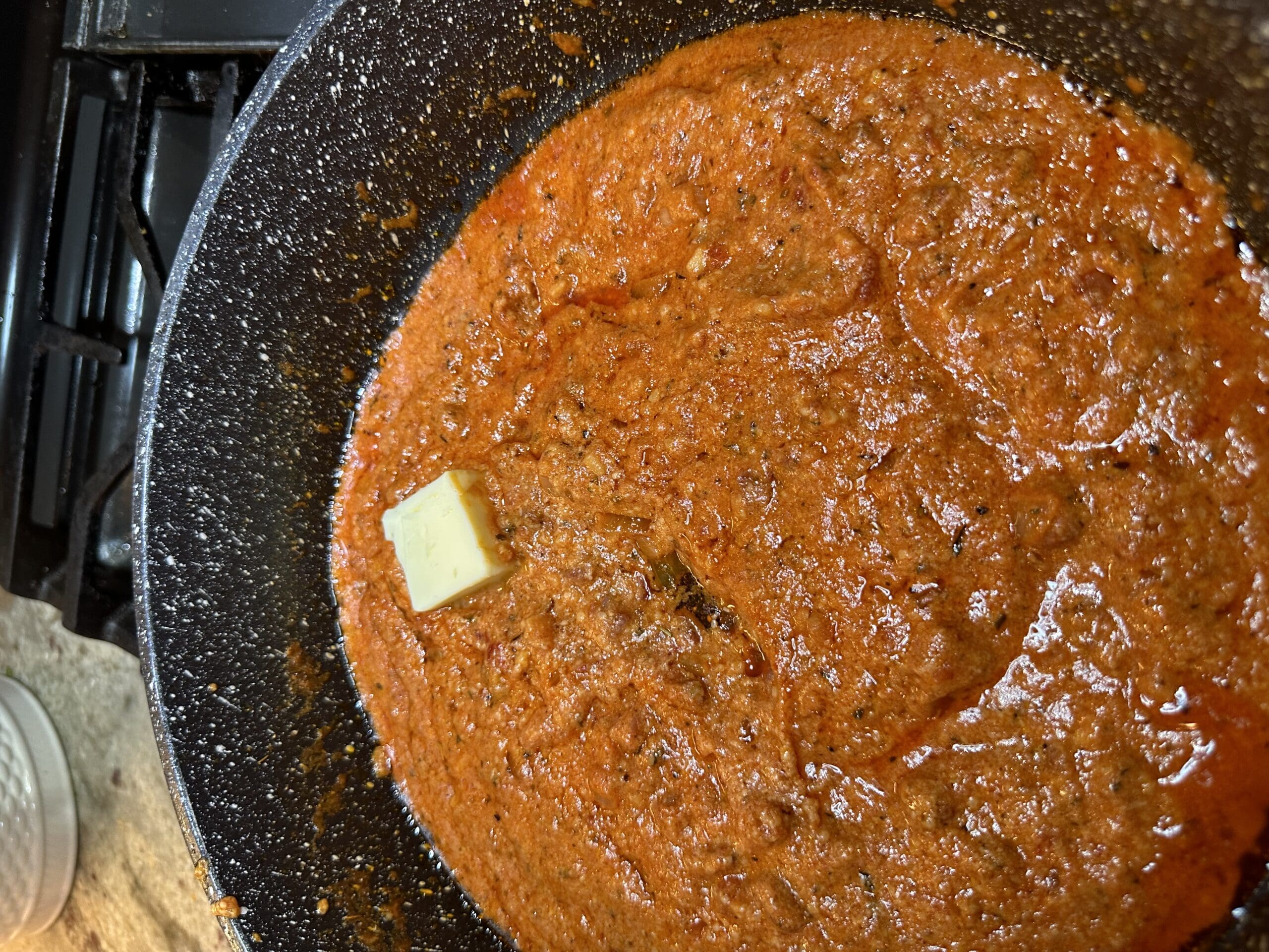 Finally add a little butter and a ladle of the gnocchi water to the sauce and stir it all together until the butter melts.