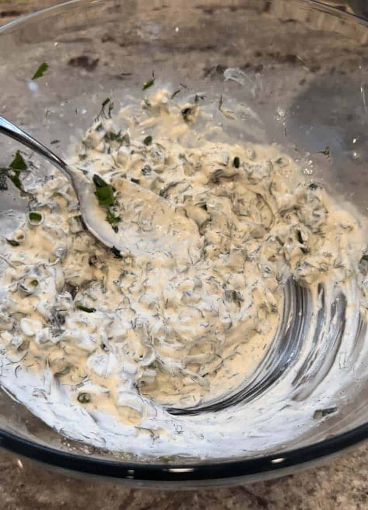 - In a large bowl, add the mayonnaise, dijon mustard, sour cream, lemon juice, dill, parsley and chives. Season with salt, pepper and the rest of the garlic powder. Stir to combine.