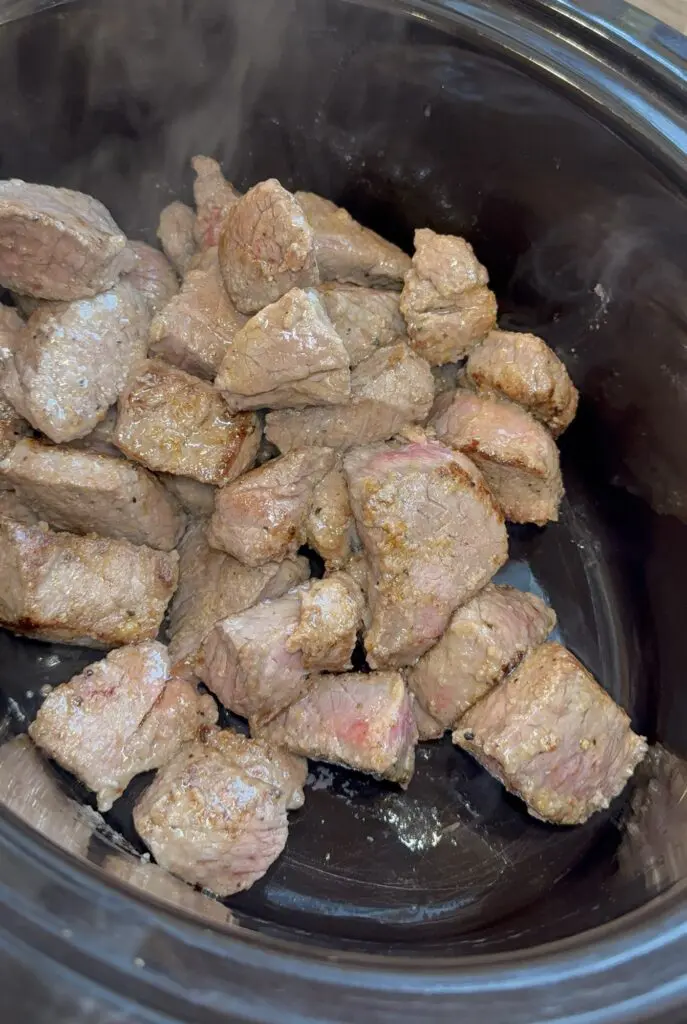 First, heat the oil up in a large pan. In a separate bowl, add the meat and season it with salt, pepper and garlic powder. Coat the meat in the flour and working in batches brown it on all sides. Don’t over cook the meat! 30-40 seconds on each side is all you need. Add the meat to a 6 QT crockpot.