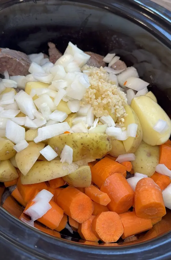 Now, add in the chunks of carrot, potatoes, onion and garlic. Pour the beef broth and over the top.