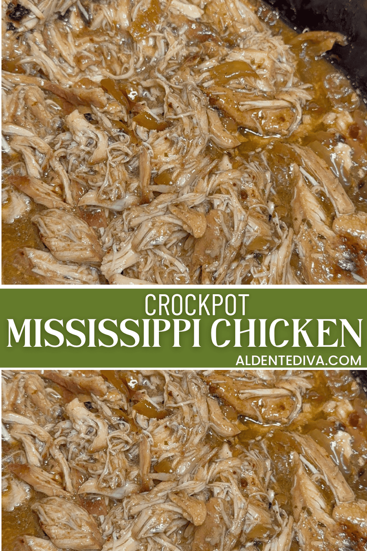 Crockpot Mississippi Chicken slow cooks chicken with dry ranch seasoning, au jus mix, pepperoncini peppers and butter for a rich, tangy, melt in your mouth dinner.