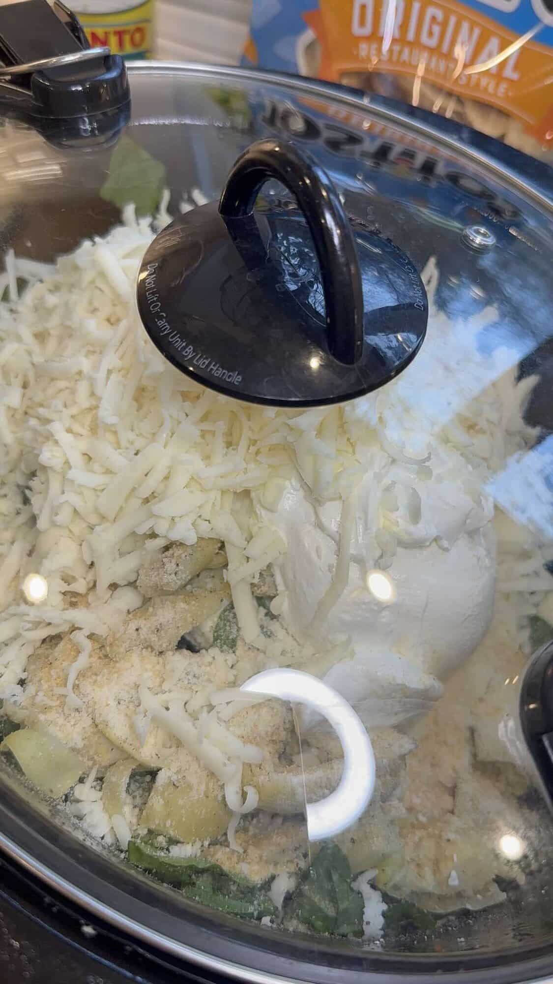First, add the spinach, cream cheese, artichokes, salt, pepper, garlic, garlic powder, sour cream, Parmesan and mozzarella cheese to a crockpot that’s been sprayed switch cooking spray. Set it on low for 3 hours.