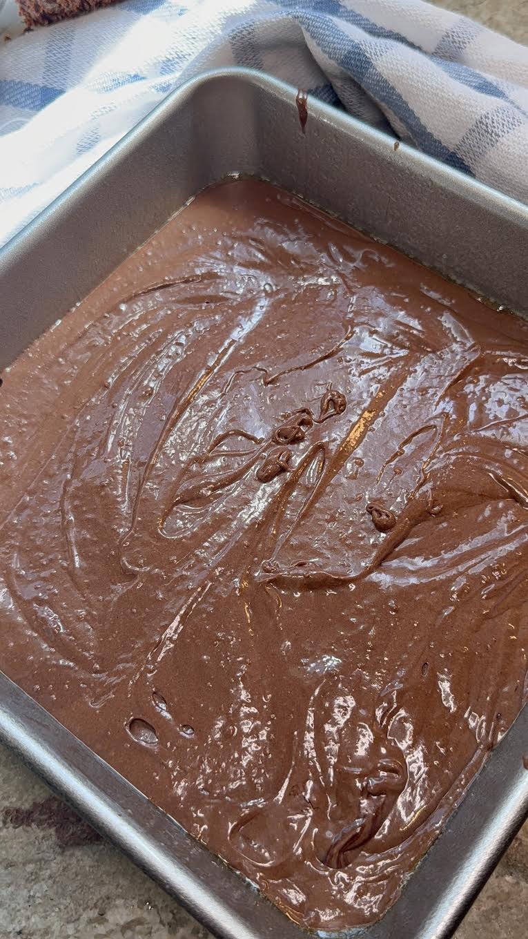 - Make the brownie batter as directed on the package and place all but ¼th of a cup in a greased 8x8" baking dish. (save that extra batter for later)