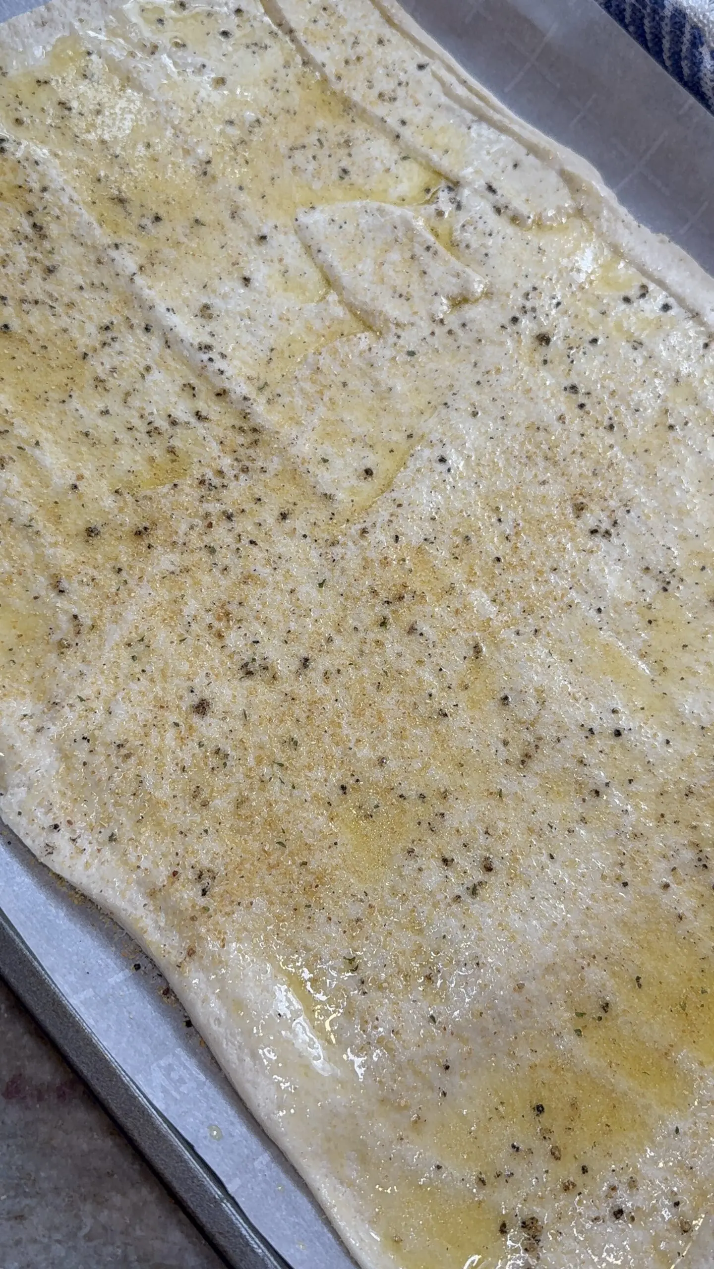 First, lay the pizza dough out on a parchment paper-lined baking sheet and roll it out until it's in a thin, rectangular shape. Pour the melted butter over the dough and using a pastry brush, spread it out all the way to the edges. Season it with salt, pepper, garlic powder and Italian seasoning.