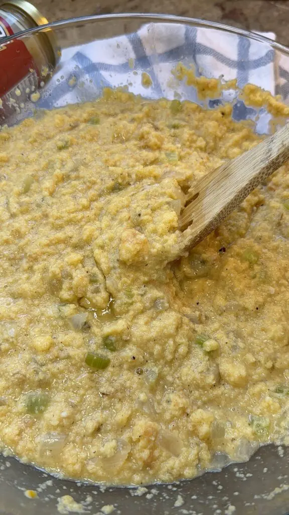 - In a large bowl, add the crumbled cornbread, sauteed vegetables, eggs, poultry seasoning, salt and pepper and chicken broth. Stir to combine.