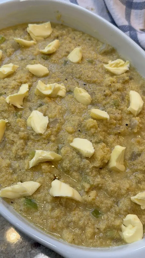 Now, add the mixture to a 2 QT greased baking dish. Add small pieces of butter to the top about 2-3” apart. Place it, uncovered, into the center rack of the oven for about 45 minutes or until the top is toasted and golden.