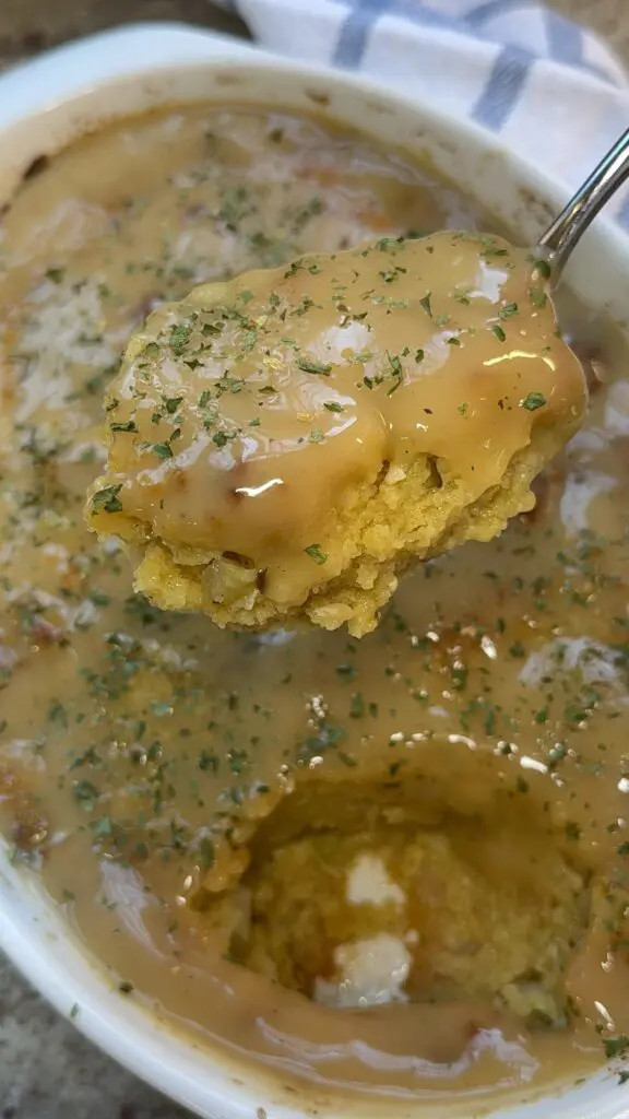Finally, let the stuffing rest for 5 minutes. Warm the gravy and add a thin layer to the top of the stuffing. Garnish with parsley and enjoy!