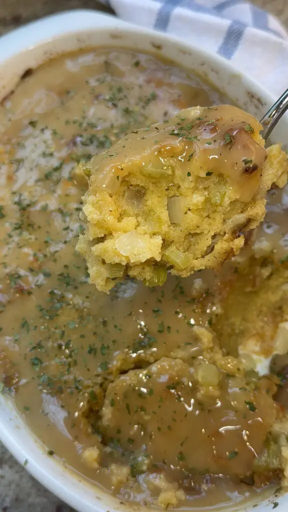 This recipe is the perfect blend of quick and comforting. The store-bought cornbread saves time, then combined with layers of savory onions, celery, and just the right balance of classic herbs makes it irresistibly delicious. It’s simple, foolproof, and bakes up with a golden top and fluffy center every time.