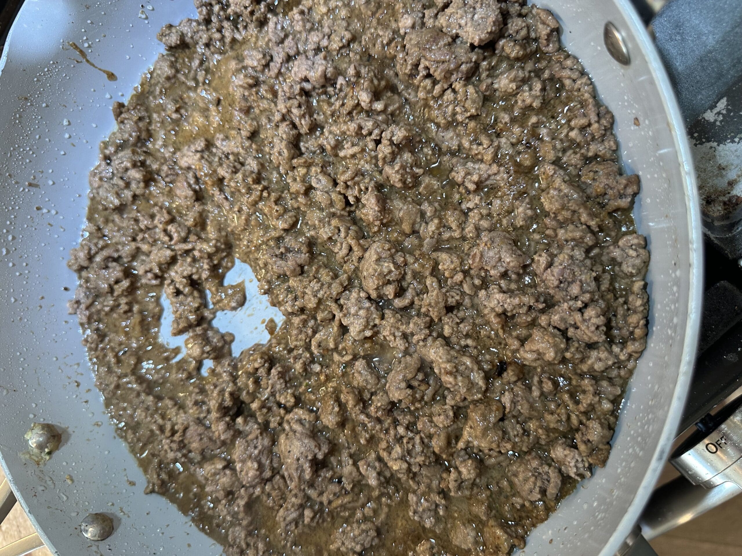 - In a large skillet, melt the butter and add the ground beef. Break the beef down into small pieces using a wooden spoon or spatula as it browns. Drain the fat from the pan once it's done.