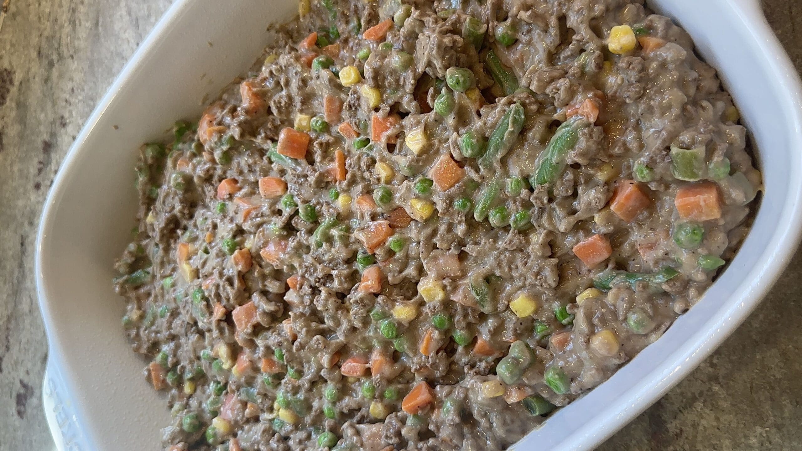 - Add the beef mixture to a greased 9x13" baking dish and smooth it out until it's evenly spread out.