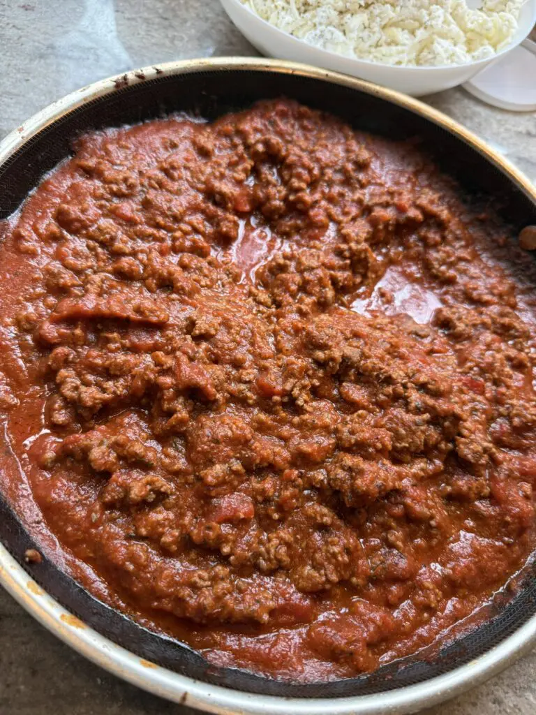NOTE: Be conscious of how much meat sauce you’re using because you want to save about a cup to top it off.