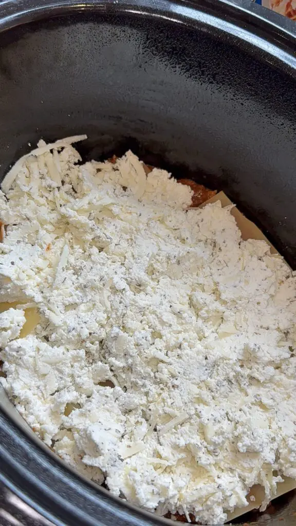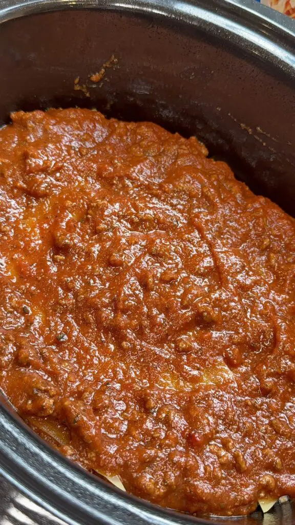 PRO TIP: Spraying the inside of the crockpot with a little cooking spray will prevent the lasagna from cooking.