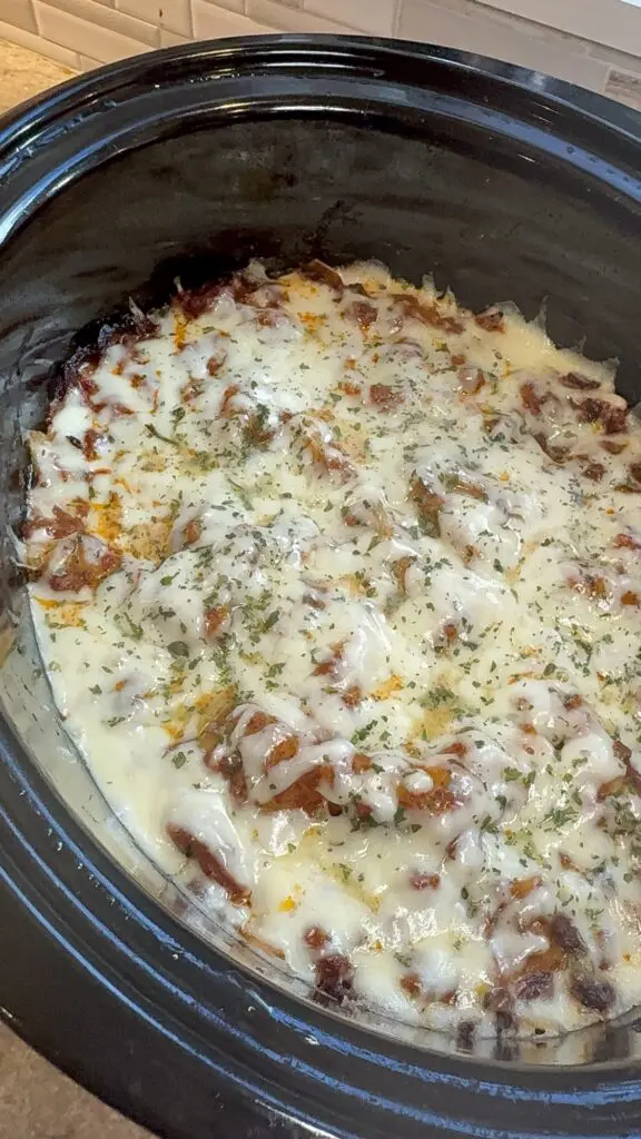 Now, add some shredded mozzarella cheese to the top and sprinkle it with parsley. Place the lid back on top of the crockpot for 15 minutes or until the cheese is melted. Serve warm and enjoy!