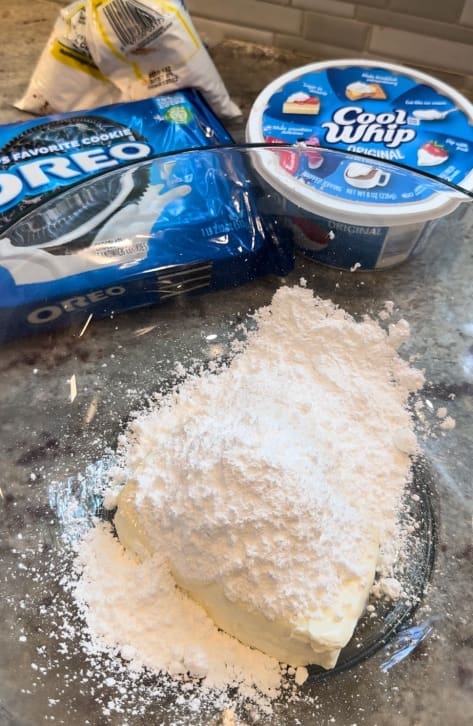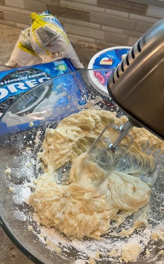 - Once the ingredients are fully combined, add them to a serving dish and garnish with the remaining crushed Oreos.