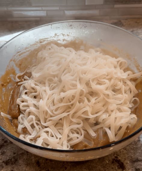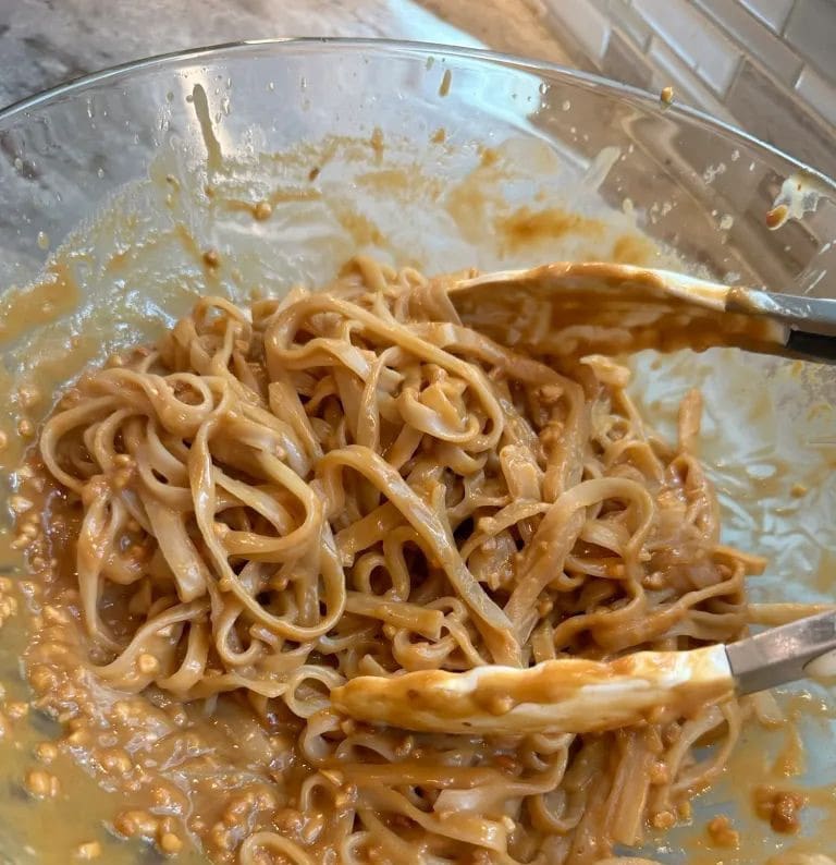 - Next, gently toss the noodles into the peanut sauce until they’re evenly coated.