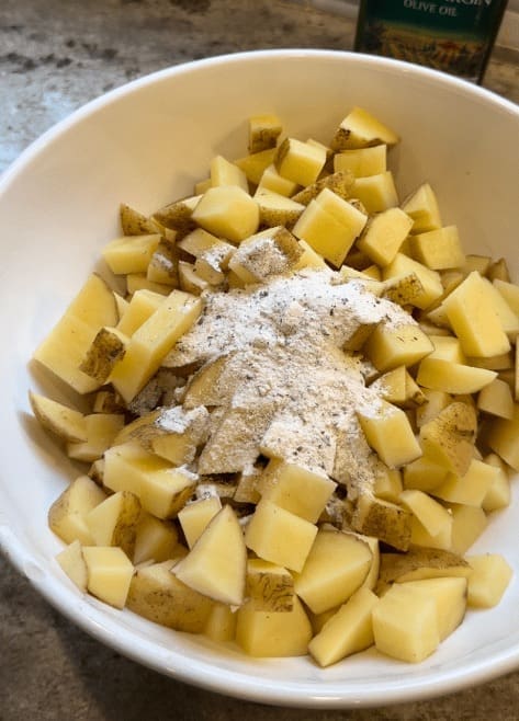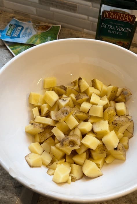 Now, in a large bowl, toss the diced potatoes with extra virgin olive oil and the ranch seasoning packet.