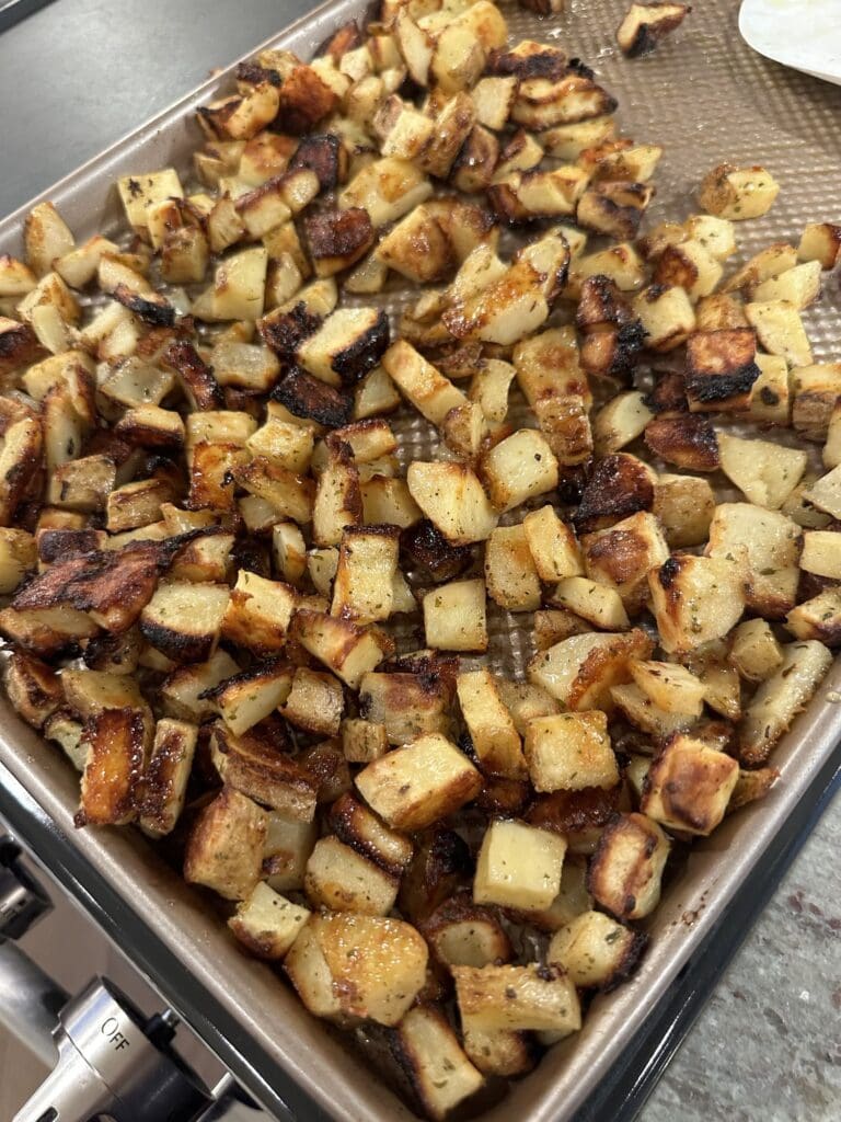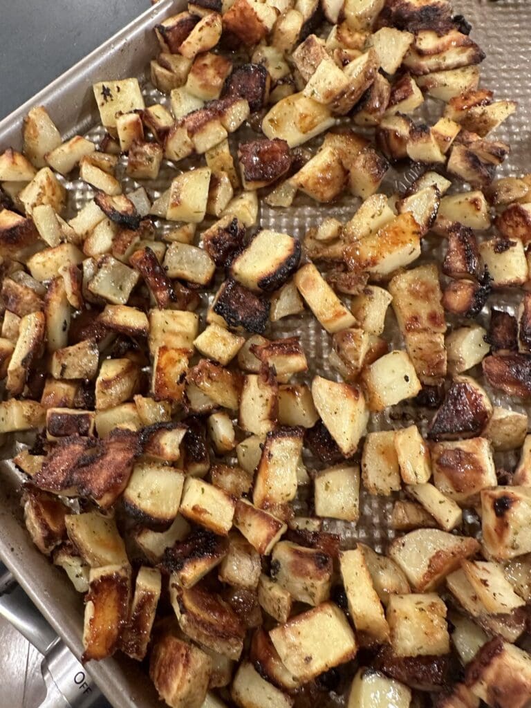 Next, bake for about 25-30 minutes, or until the potatoes are crispy and fully cooked. I recommend tossing them with a spatula halfway through to ensure even cooking.