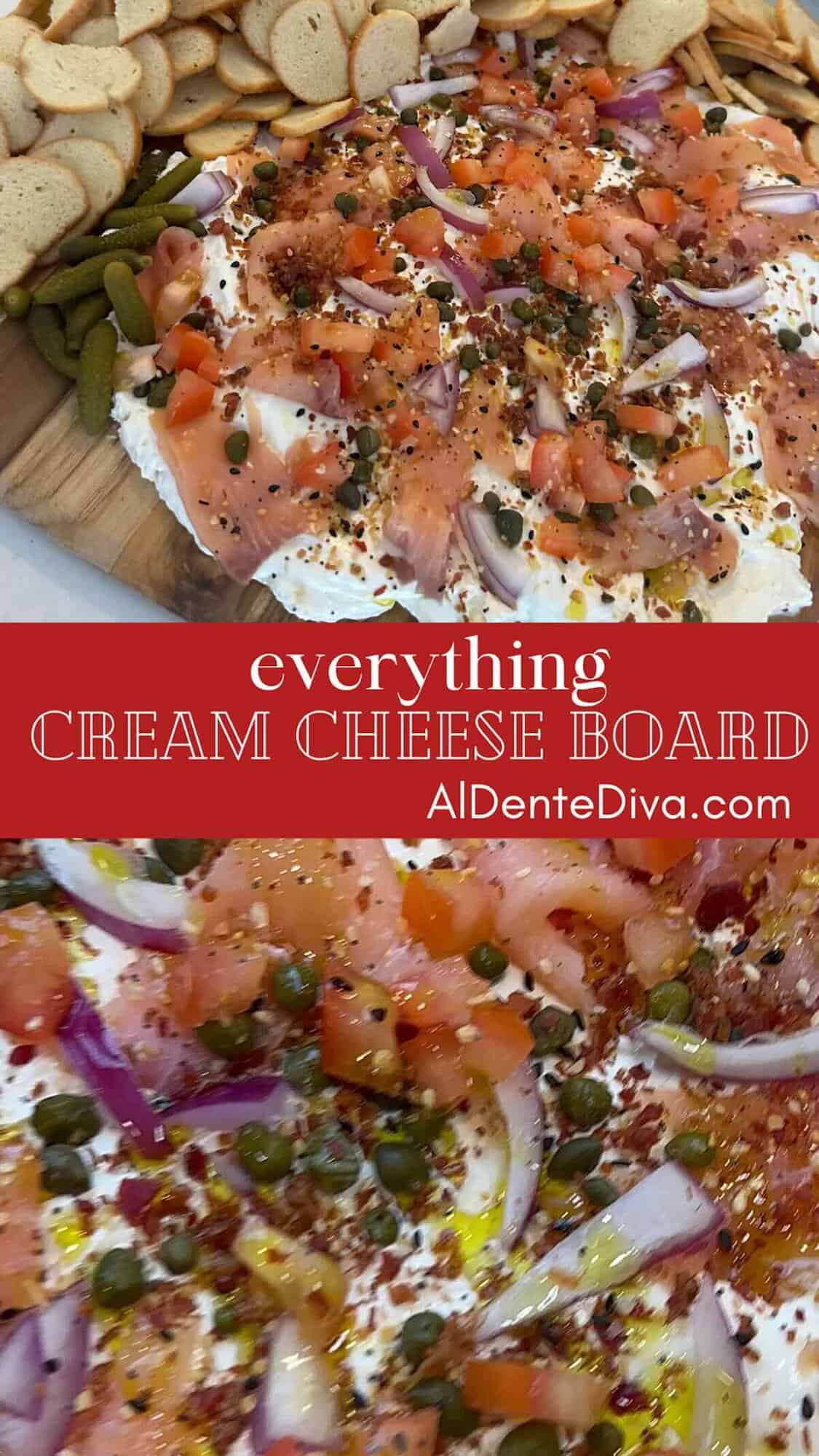 This everything cream cheese board takes whipped cream cheese and loads it with all of your favorite toppings like lox, red onion, tomatoes, capers and more.