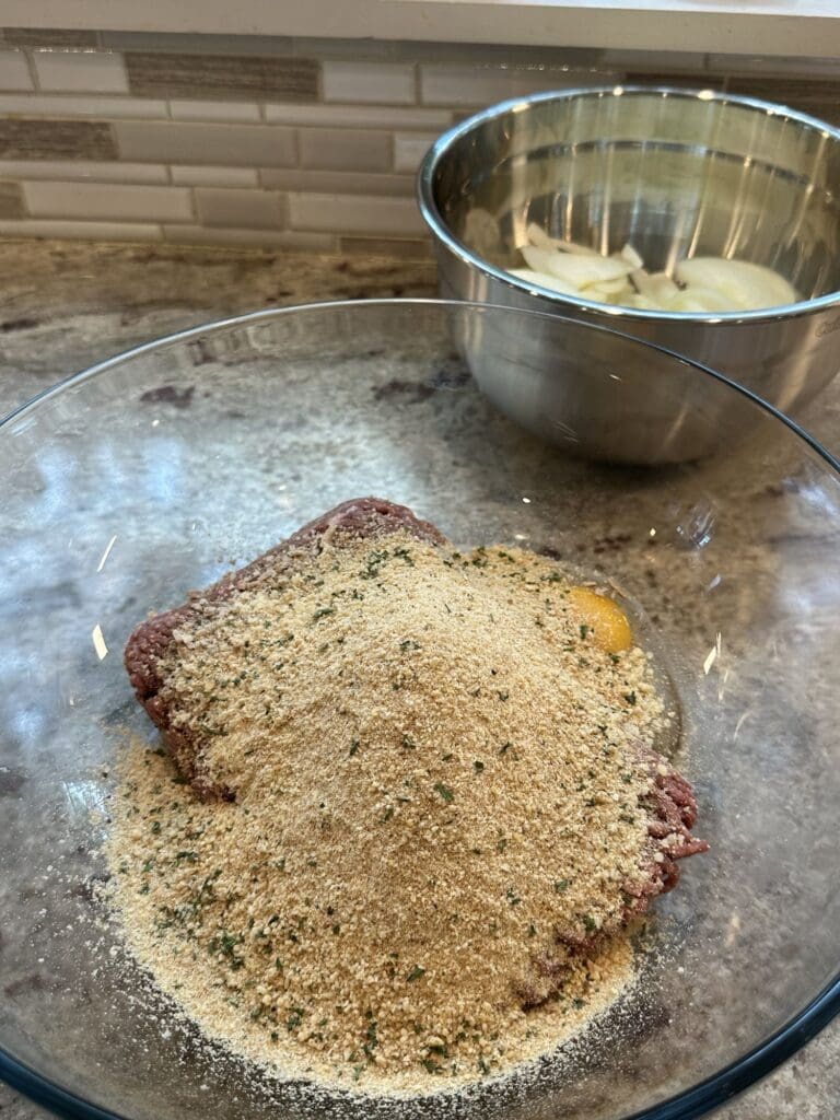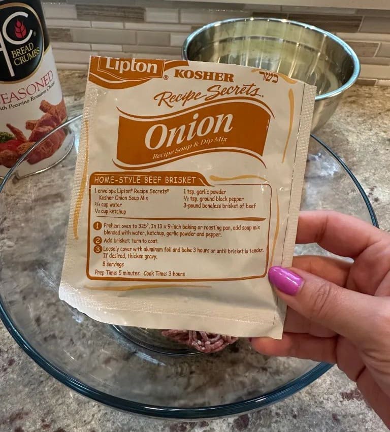- First, combine the ground beef, onion soup packet, egg, breadcrumbs, milk, Parmesan cheese, salt, pepper and 1 tbs of garlic powder in a large bowl.