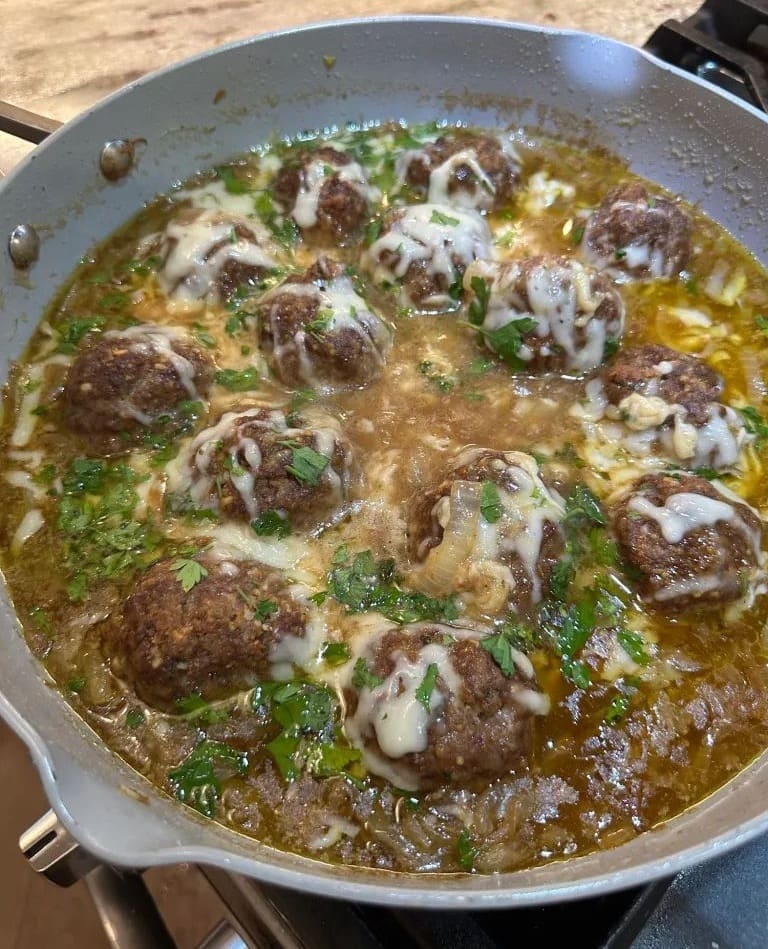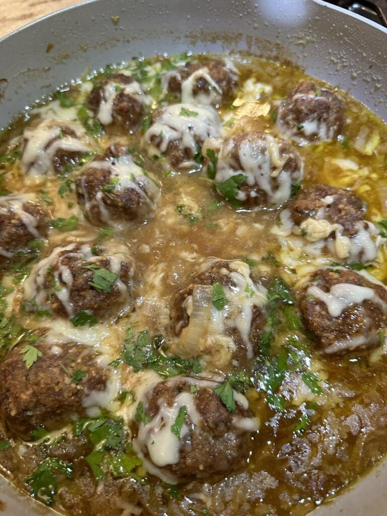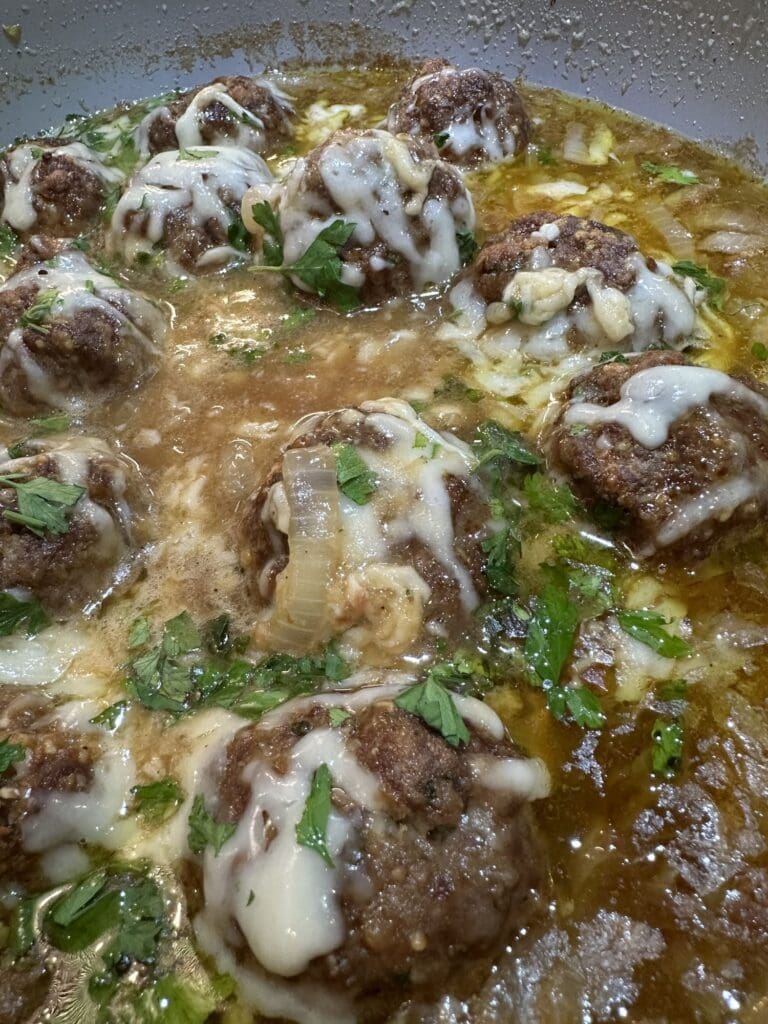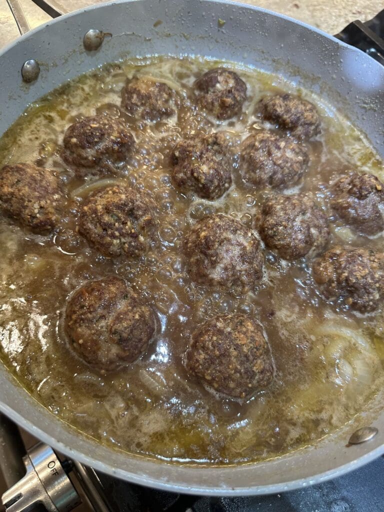 - Once the meatballs are done, carefully add them to the onions and beef broth.