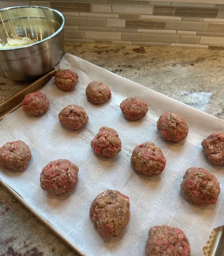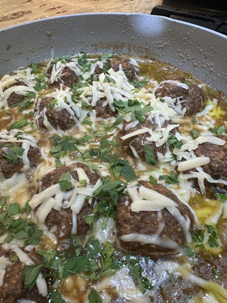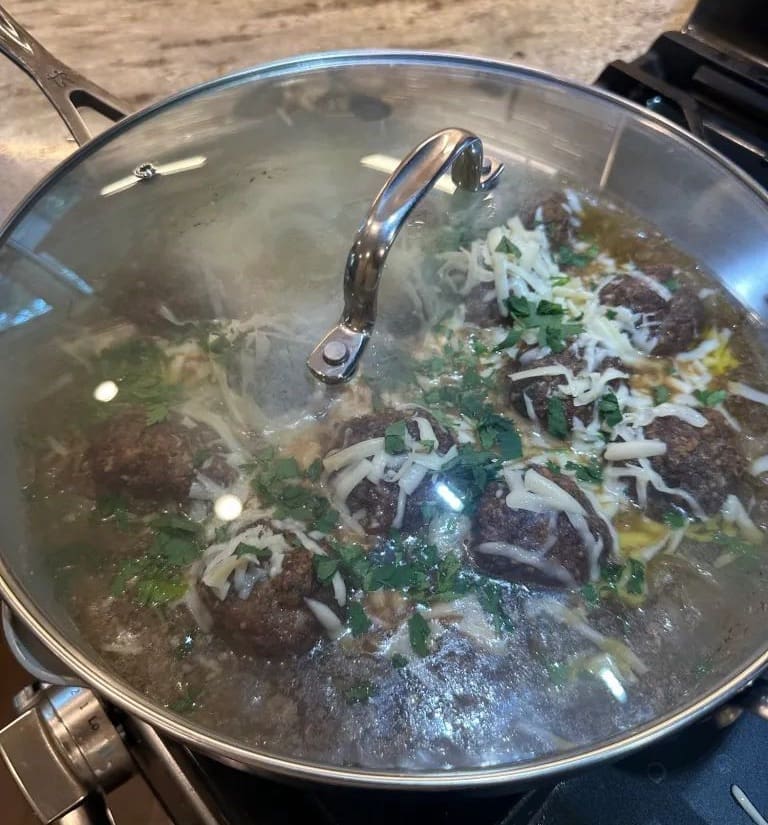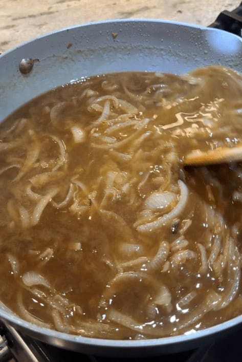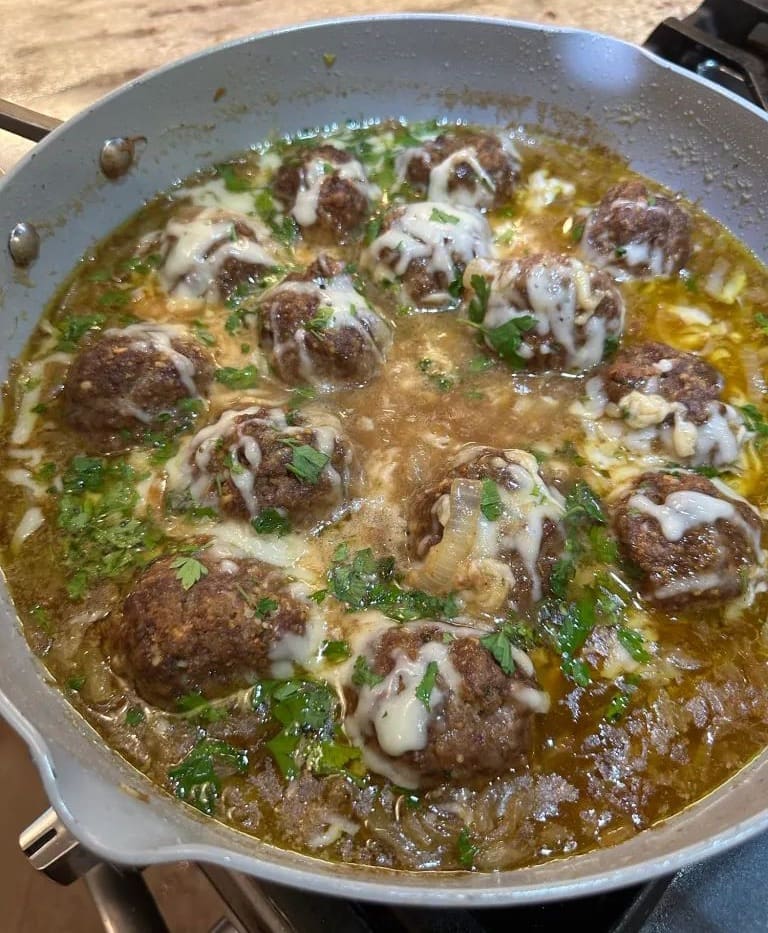 - Once the meatballs are done, carefully add them to the onions and beef broth.
