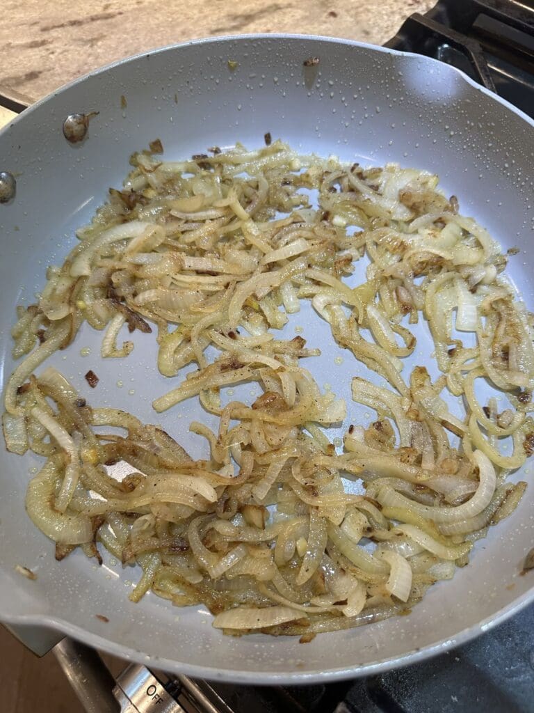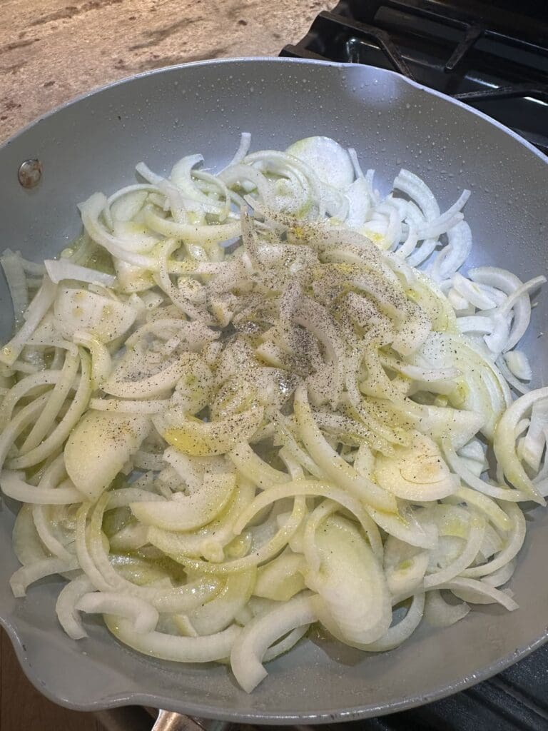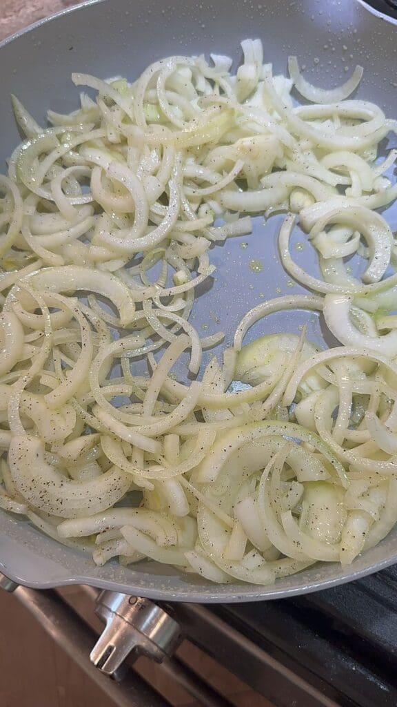- In the meantime, heat the oil in a large pan and add the sliced onions. Cook them for about 10 minutes or until they begin to soften.
