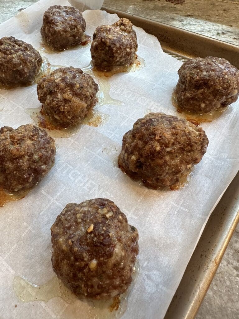 Now, form them into small to medium, equal-sized meatballs and place them onto a parchment paper-lined baking sheet.
