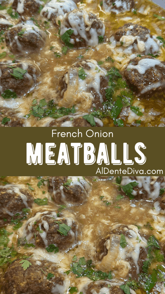 These delicious French onion meatballs are made with French onion seasoned ground beef simmered in a flavorful sauce and covered in gooey cheese.