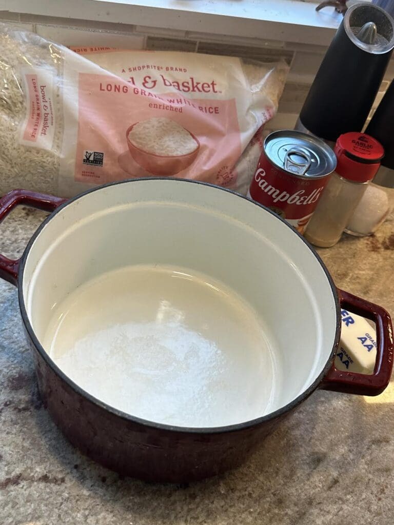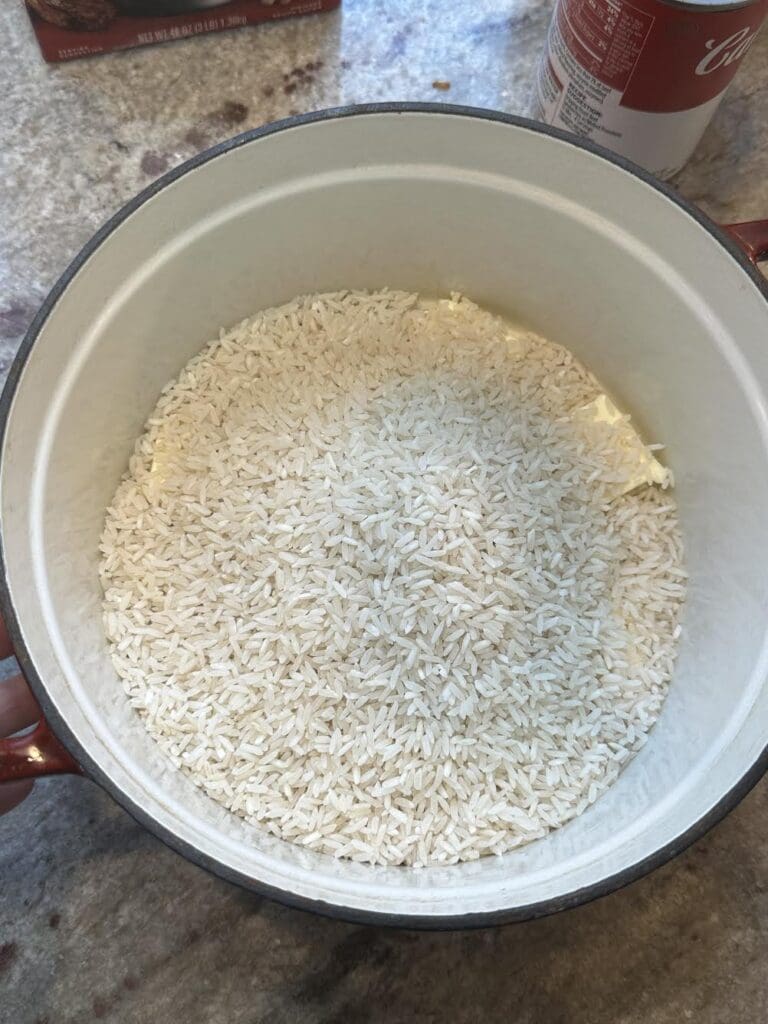 - Now add the rice, beef broth, soup and seasoning.