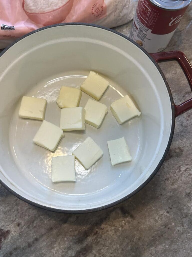 - First, add the butter to the bottom of a dutch oven or baking dish.