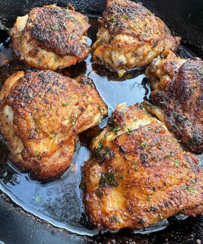 - Now, spoon some garlic butter over the chicken thighs and place the skillet into the oven for about 15 minutes.