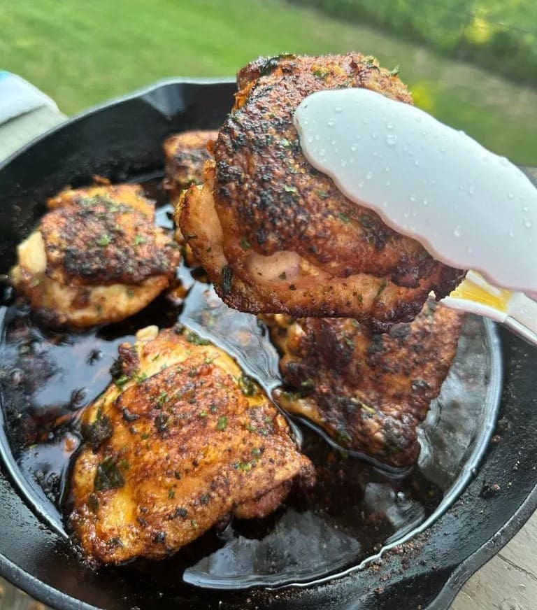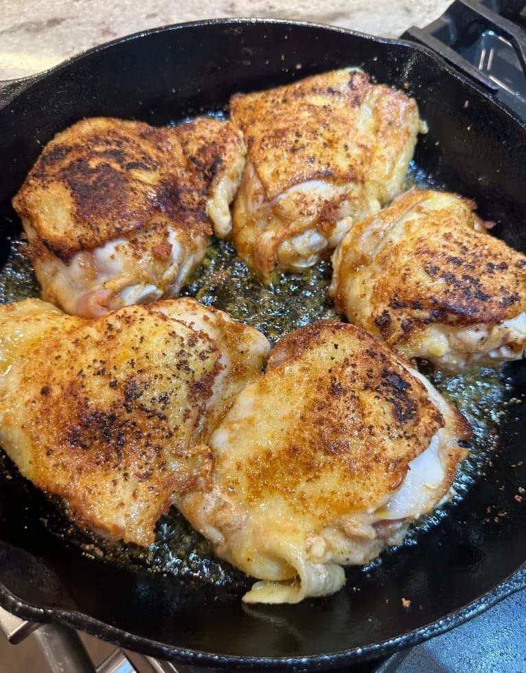 - Now, sear the chicken thighs on both sides for about 5 minutes or until the skin is brown and crispy.