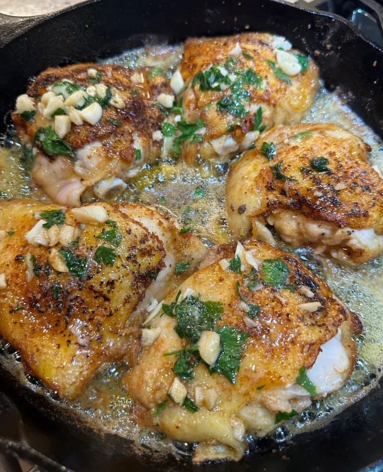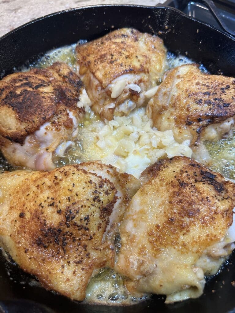- Next, arrange the chicken skin side up and turn off the heat. Add the butter, garlic and parsley to the center and let the butter melt.