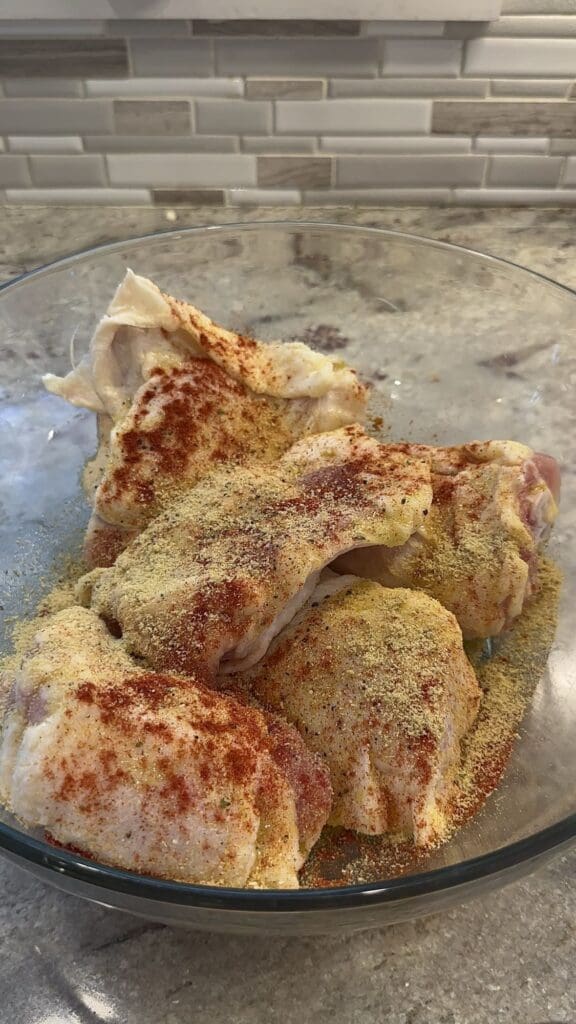 First, pat the chicken thighs dry using a paper towel and add them to a large bowl and add the olive oil, salt, pepper, garlic powder, paprika and chicken bullion.