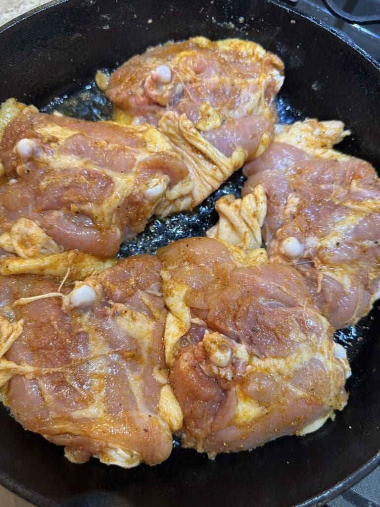 - Then, heat a cast iron skillet (or an oven safe pan) over medium high heat, and add the chicken thighs skin side down.