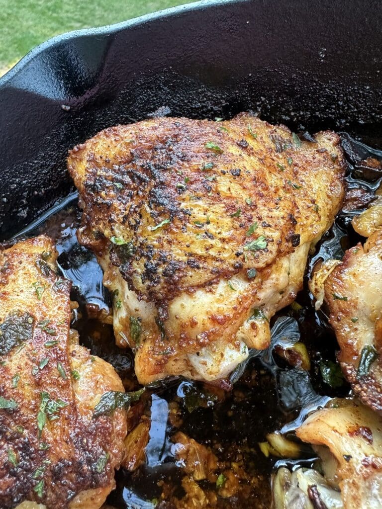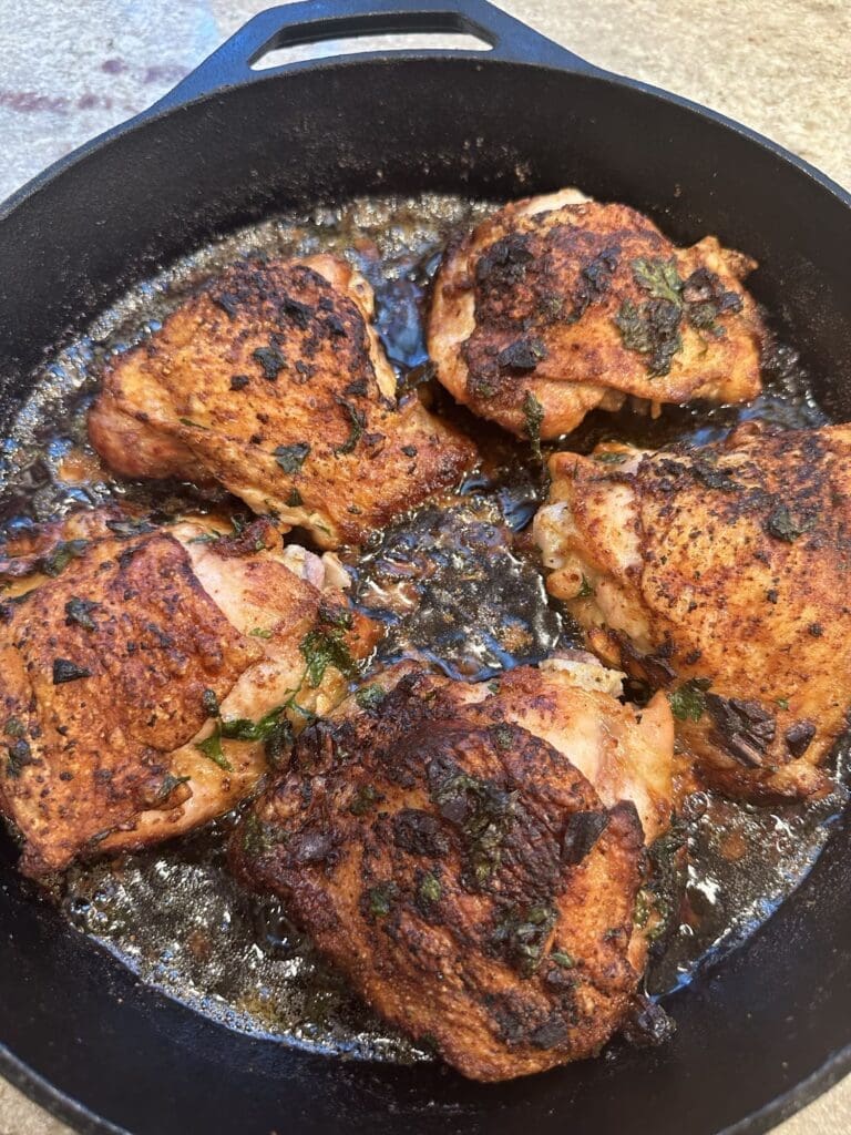 Now, sear the chicken thighs on both sides for about 5 minutes or until the skin is brown and crispy.