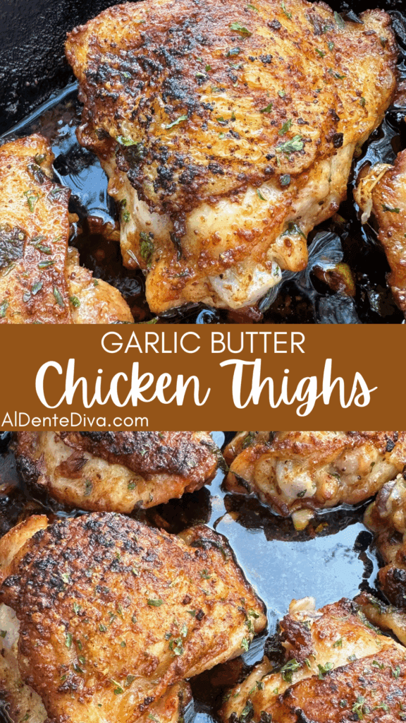 Garlic butter chicken thighs are perfectly seasoned pieces of chicken baked in butter and garlic with crispy skin and tons of flavor.