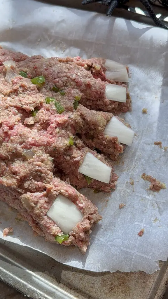 - Onion- Adds flavor to the meatloaf mix and also acts as super creepy and gross toe nails and exposed bone.