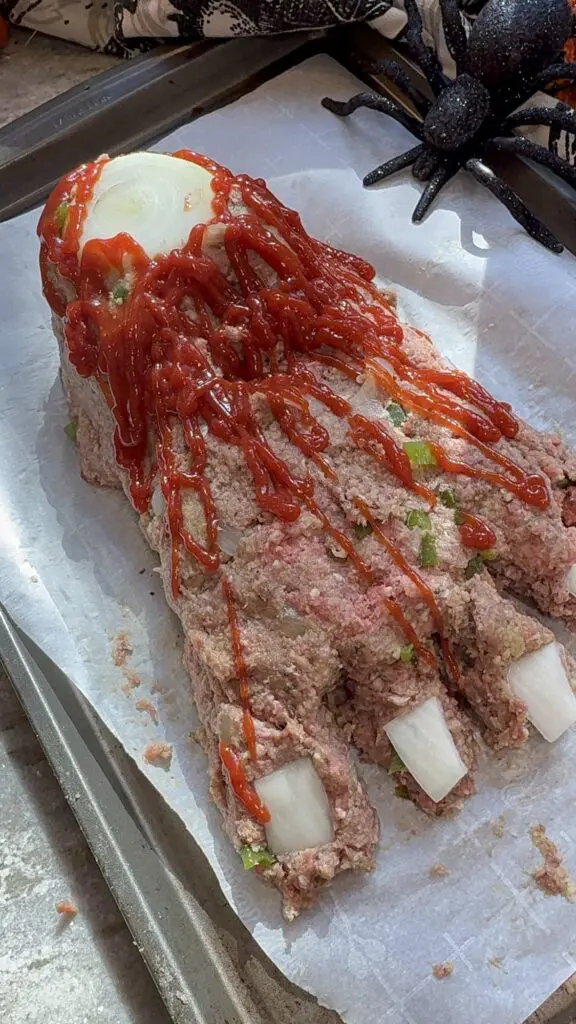 A gruesomely delicious twist on classic comfort food, this Halloween meatloaf foot is molded into the shape of a severed foot—complete with “bloody” ketchup glaze and creepy onion toenails—for a spooky Halloween dinner that shocks and satisfies.