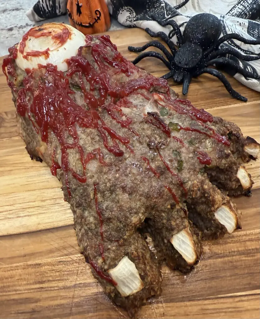 A meatloaf shaped like a creepy severed foot is the ultimate Halloween showstopper. It’s equal parts delicious and disturbingly fun. It takes a classic comfort food and transforms it into a spooky centerpiece that gets everyone talking before they even take a bite. With browned “skin,” onion toenails, and oozing ketchup “blood,” it brings just the right amount of playful gore to your Halloween table while still delivering that hearty, homemade meatloaf flavor everyone loves. It’s gross, it’s clever, and it’s guaranteed to be the most unforgettable dish at any Halloween party.