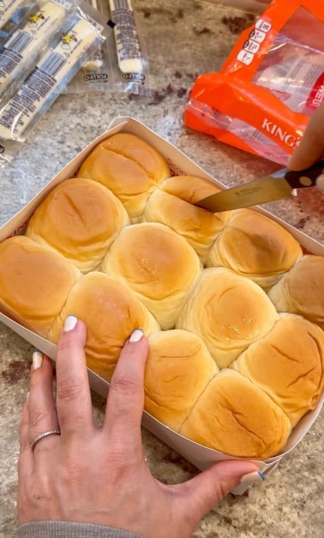 First, remove the Hawaiian rolls from the packaging and using a sharp knife, cut along the center of each roll, vertically. Be careful not to cut through completely.