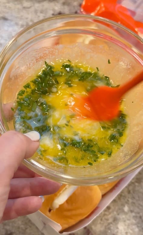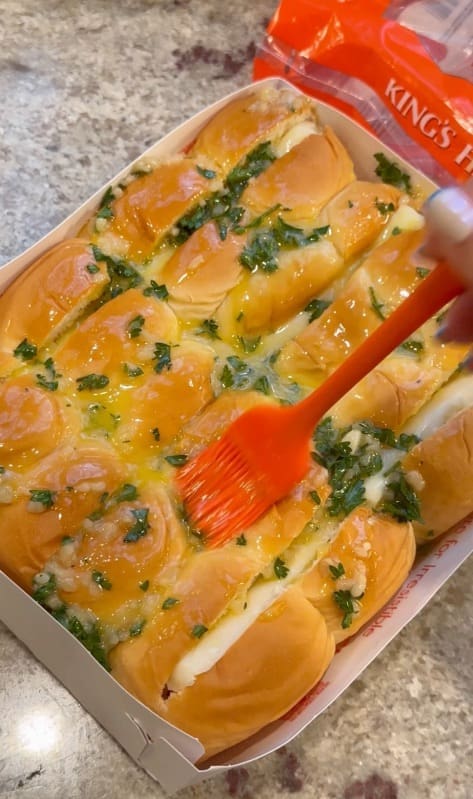 - Next, pour the garlic butter over the top of the Hawaiian rolls and using a pastry brush, spread it out as evenly over the rolls as you can.